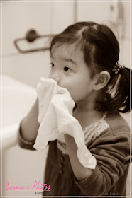 | 昨天早上我改變Elaine的洗臉方法, 和她玩了另一種方法, 她喜歡, 而且可以很清楚知道步驟; 我只能說:我太天才啦!被我找到方法了,一樣都要設梯度。 今天早上她很開心的在練習洗臉這個活動。 |
