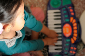 | 等媽咪準備好東西出門的期間, 她突然自己在地上彈琴, 還有模有樣的在調音, 調到喜歡的就邊擺動身體邊彈琴。 |