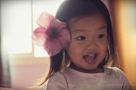 | YA?!...正在做搞怪的表情。 (這支大花兒好不容易乖乖聽話在Elaine的頭髮上, 放好之後馬上出現這個表情。) |