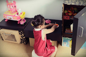 | 所以第二天順便增加一個切菜處理檯面。 材料是尿布的紙箱翻過來重新密封, 裡頭就能再裝東西被利用。 還有好市多的裝葡萄紙盤做的, 最上層再去買一張海報紙大小的雲彩紙貼上, 目的是配合另外從IKEA買回來的紙箱。 |