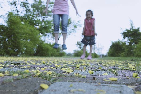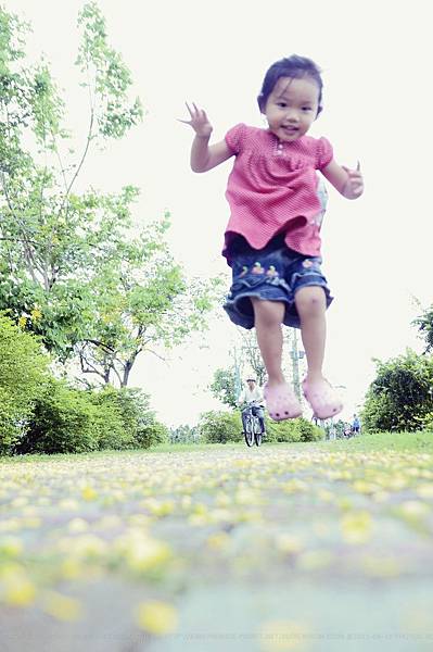 Elaine小朋友撿起一片片的花瓣說:「媽咪,好像下雨。」