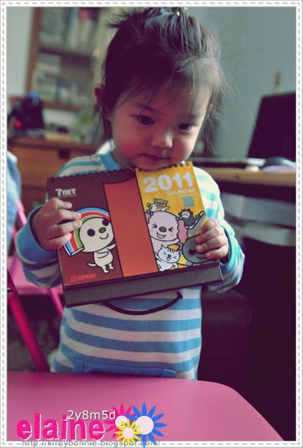 Elaine很開心看到月曆,馬上一頁一頁翻來看,這張是翻完之後拿給媽咪拍照的。 |