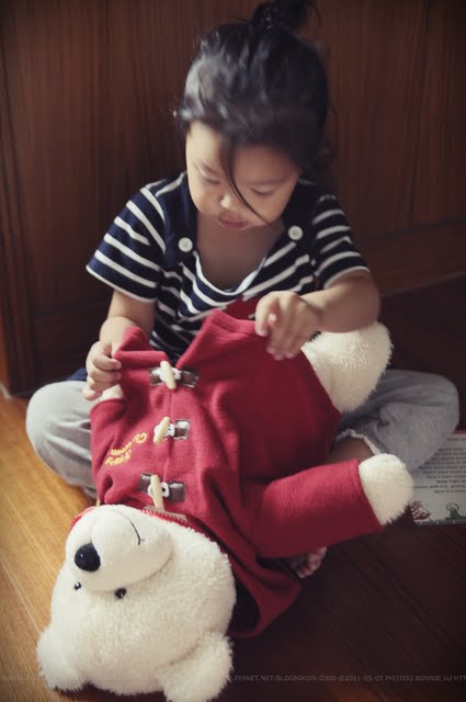 | 接著開始檢查熊熊的頭髮。 只要有空想到就會問:「妳的熊熊有頭髮嗎?」 然後,我都會回答:「我沒有熊熊,所以不知道。」XD |